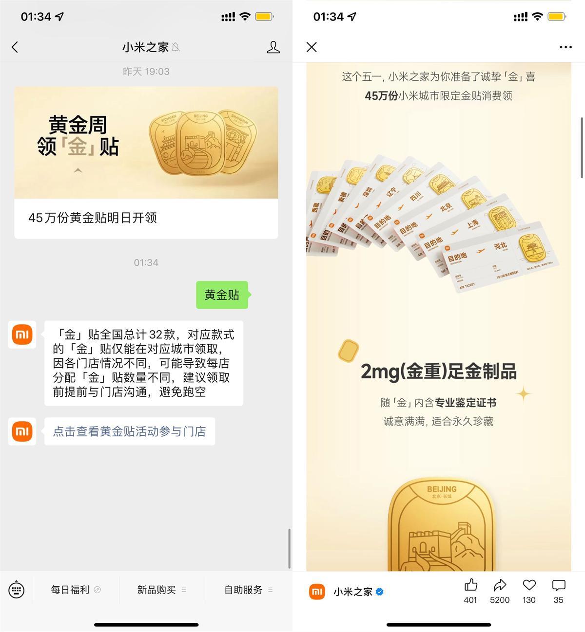 微信关注#公众号:小米之家 ->回复“黄金贴”可查看活动门店->到店 任意消费+带话题#小米黄金周送黄金贴#发微博或小红书或抖音 即可领取2mg黄金贴