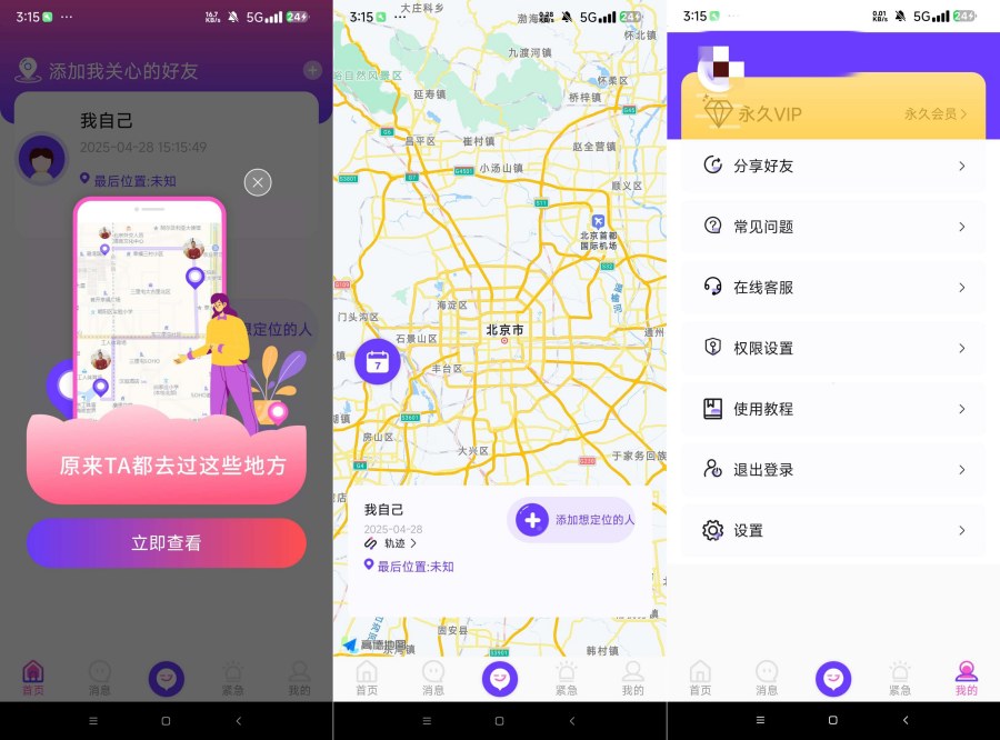 用户在使用过程中可以更好地守护伴侣、老人、孩子及亲朋好友。亲朋家人出游,实时查看亲朋好友的位置,准确到达预定出游地点,守护亲友安全。好友实时位置共享,SOS紧急求助 解锁永久会员。