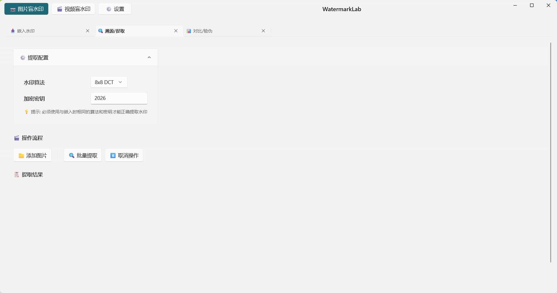 盲水印是一种数字水印技术,指将标识信息(如文字、数字或图像)以不可见的形式嵌入到数字媒体(如图片)中,嵌入后内容几乎无法被肉眼察觉但可以通过特定算法提取出来。这种水印是无感的。软件介绍