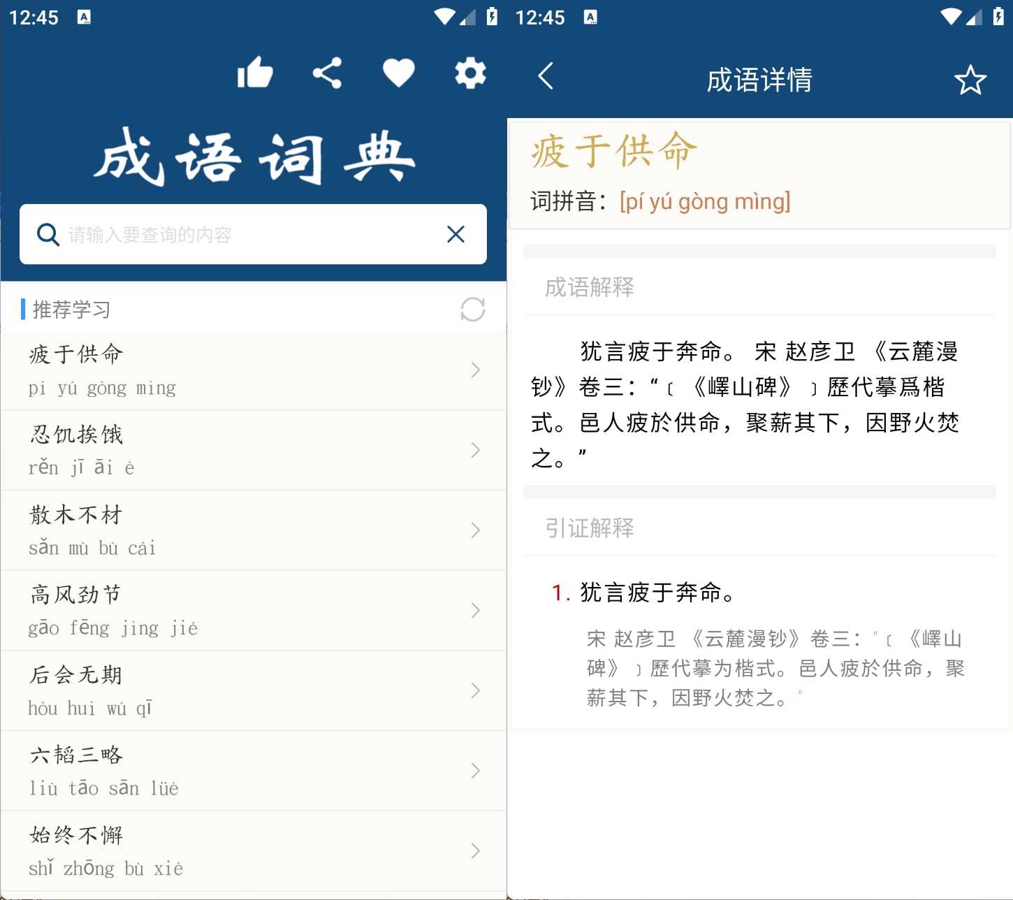 成语词典:离线查询与学习工具 - 收录超5万条成语及故事 本应用是一款功能完备的离线成语词典,收录了超过五万条成语词条。每条成语均提供详细释义、出处、用法实例等解释内容,并包含一千余个成语故事,旨在为用户提供一个无需联网、可随时查阅的系统性成语学习工具软件介绍